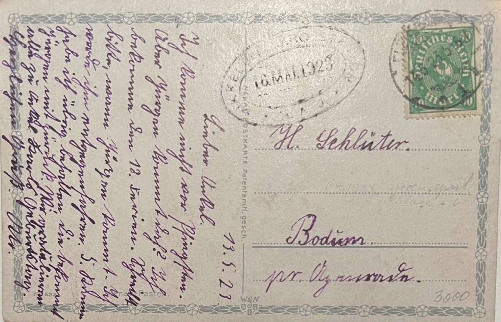 Postkort sendt fra Flensborg til Bodum pr. Aabenraa som grænsepost. Fejlsendt ad det kringlede jernbanenet